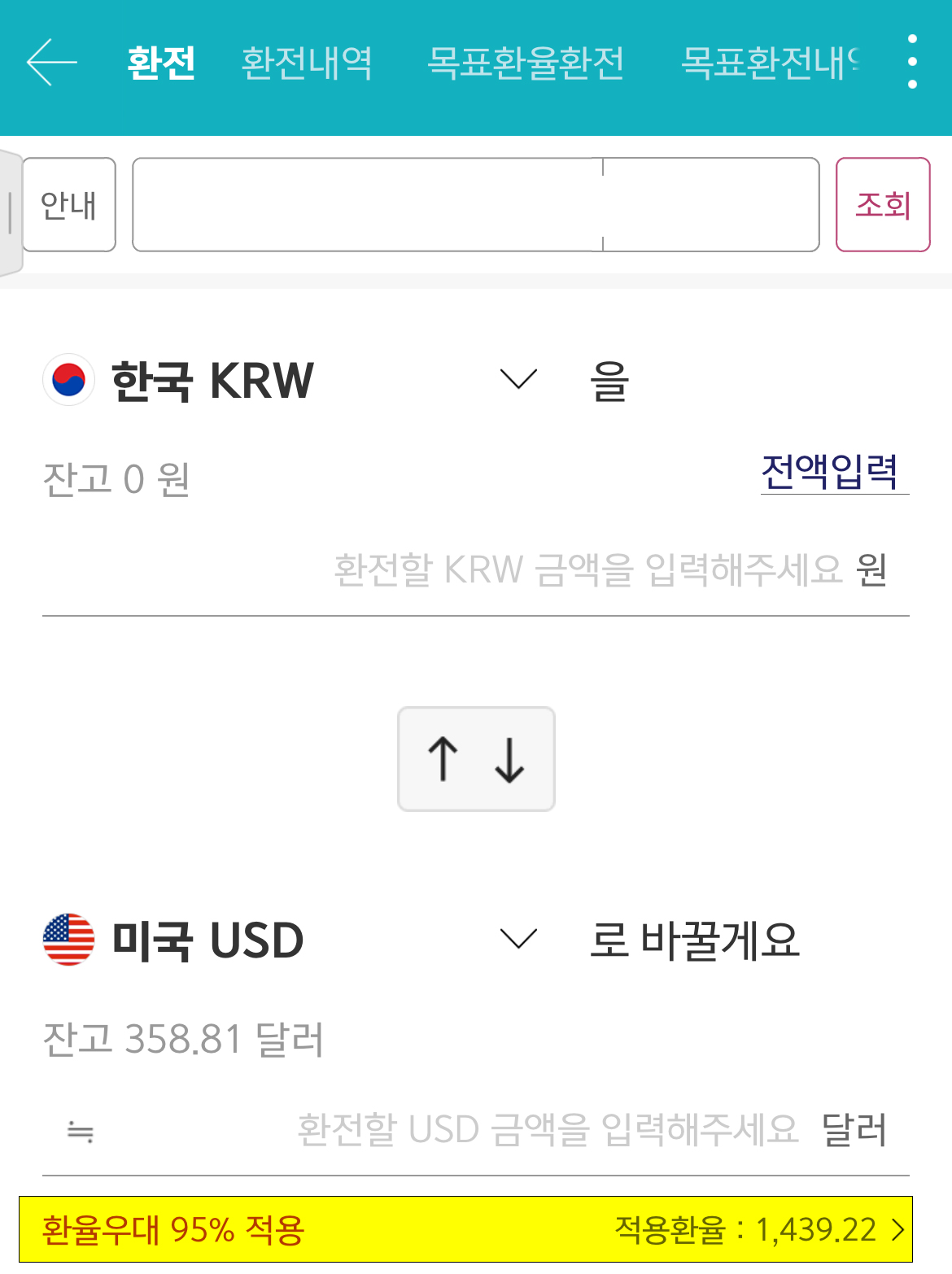 앱 메인 화면 가장 하단의 메뉴를 클릭하고, 환전 탭에서 환전으로 들어갑니다.