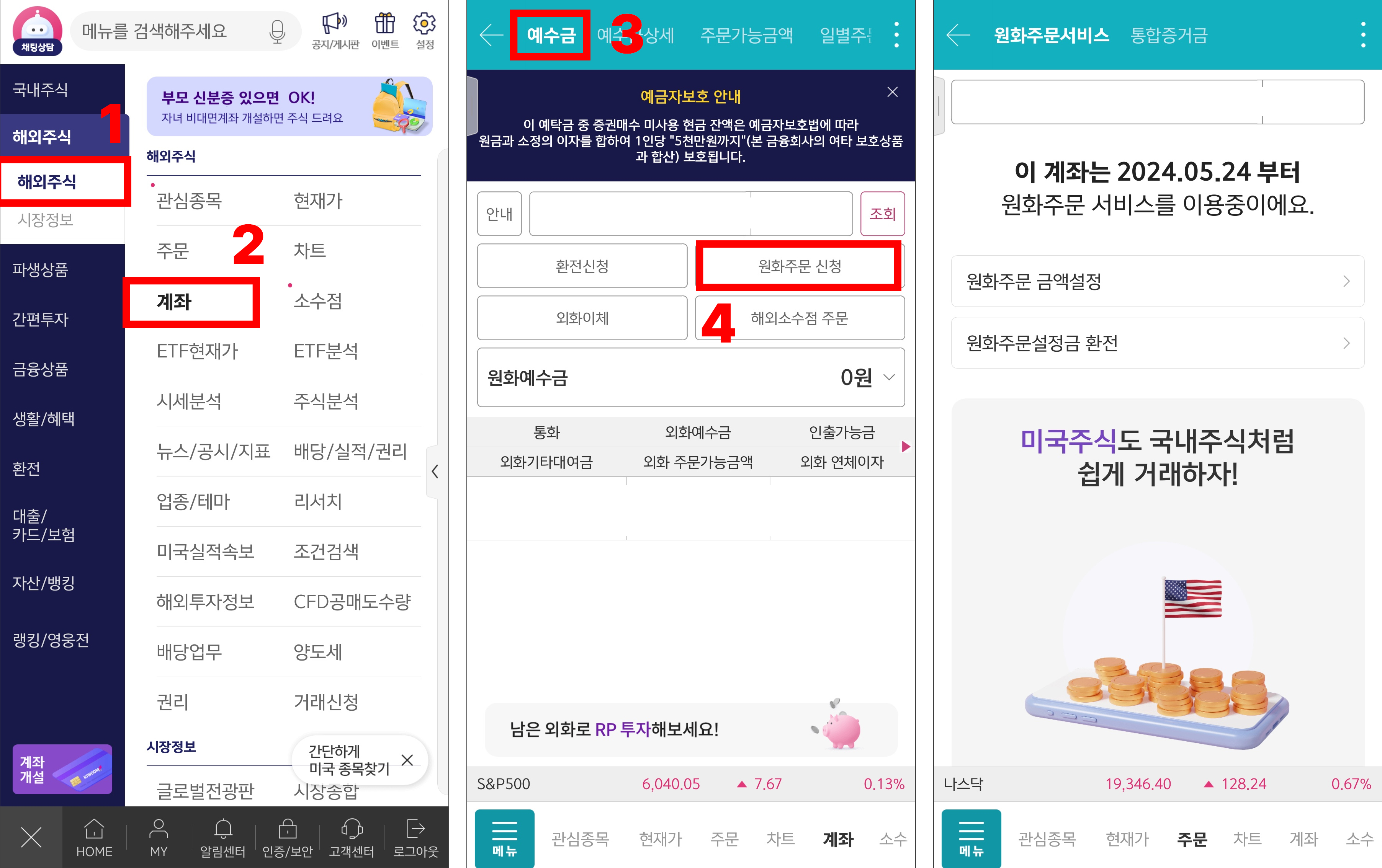 해외주식 > 계좌로 들어가서, 맨 위의 메뉴를 넘기다 보면 예수금이 나옵니다. 여기서 원화주문 신청을 누르면 해당 서비스를 신청할 수 있습니다. 저는 5월달에 이 서비스를 신청해놨는데도 모르고 계속 환전하고 주식 매수를 했더라구요..^_^